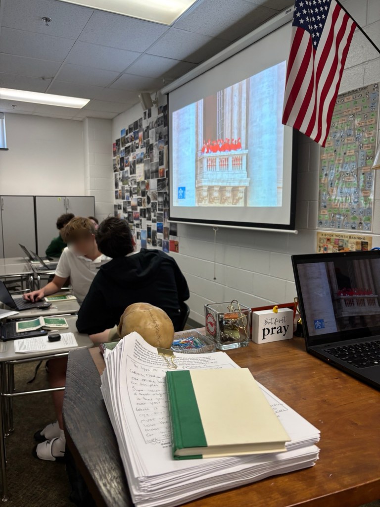 The start of a second decade of teaching brought fresh concerns. In the very early years of my career, I was concerned about survival (How would I get it all done? How would I deal with the workload and student problems and curriculum demands?). As time passed, I became more concerned about effective teaching methods (What’s the best way to get my students to master this skill? How can I make this both engaging and rigorous?). In the past couple years, I sought deeper meaning (Am I making a difference really? Do I actually enjoy this? Is this where I want to spend my life?). These questions that drove me in the first 10 years of my career have been largely settled by experience, a variety of shifts in educational trends, and a move to a new school. Now, my thoughts about teaching are largely concerned with the personal and spiritual impact I have on students. I know I am a strong teacher of content, that my students learn the subject of English in my class. Yet, I’ve realized that there’s so much more to my potential impact on my students. At Gibbons, I’ve had the freedom to select the literature I teach in my classroom, and I find myself selecting books that challenge students on political, spiritual, and ethical issues. As a teacher at a Catholic school, I feel an abiding responsibility to represent the faith well, to push my students to think about their own beliefs, to encourage us both to wrestle with the morally gray, to reconcile the good and evil that lives within every human. This year, we read a novel with an allusion to the Shakespeare quote I opened this post with, and I found the words rattled me: there is a burden to this much responsibility, to the ~130 students who have been entrusted into my care.